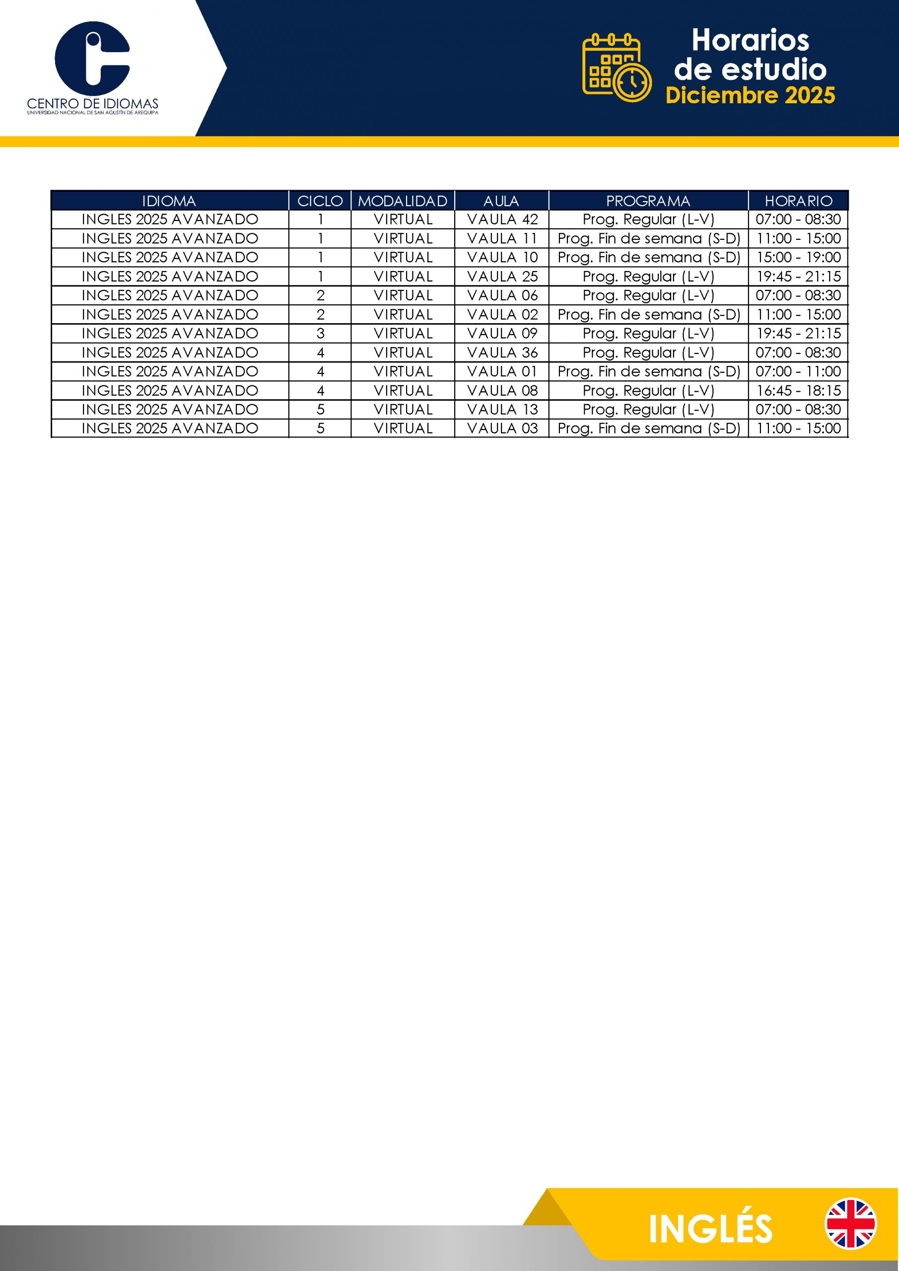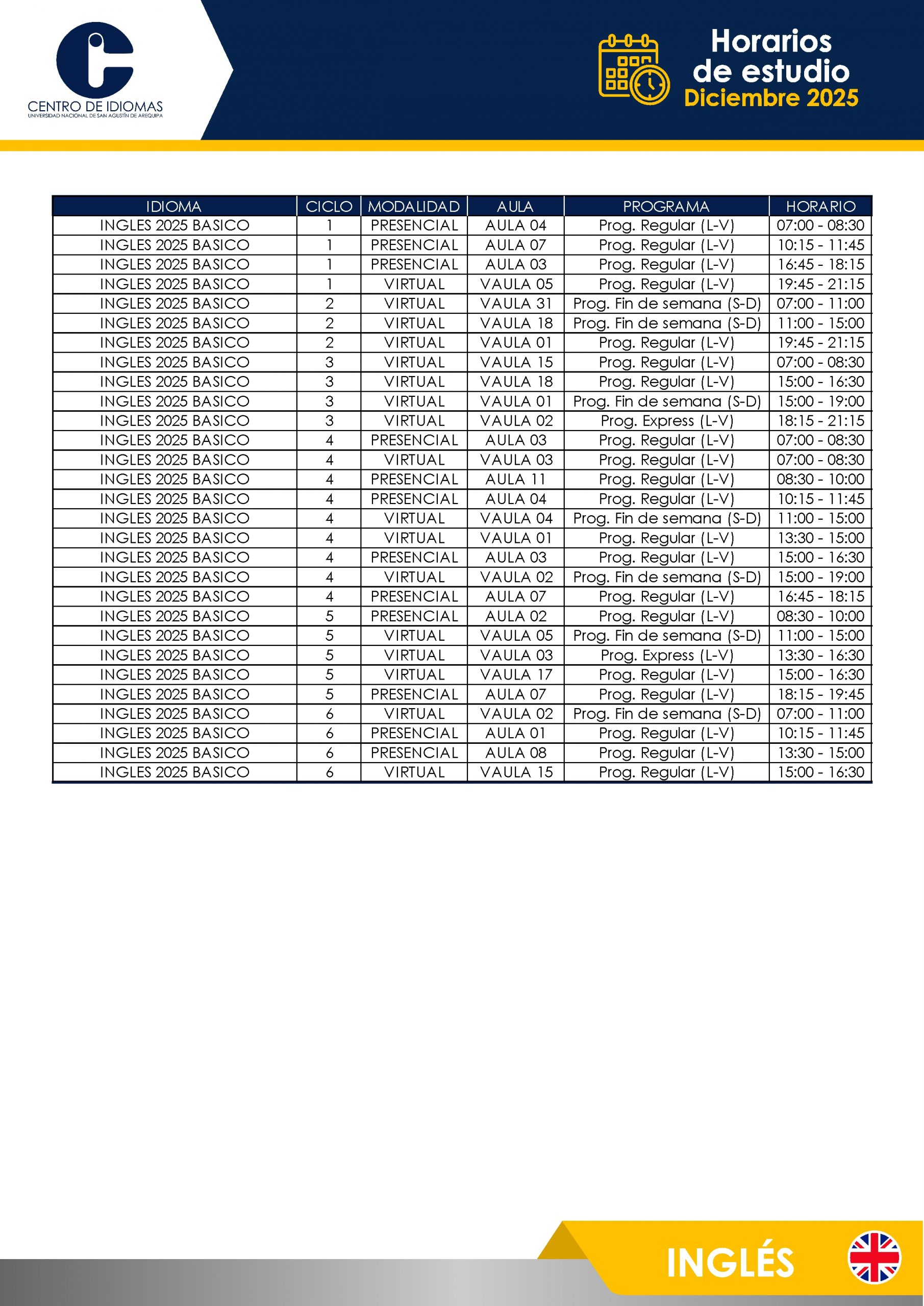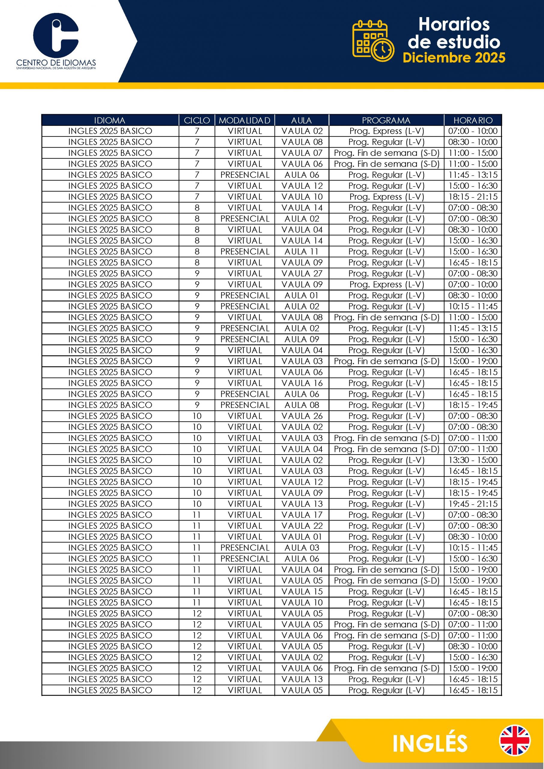 HORARIOS DE ESTUDIO DICIEMBRE 2025 Inglés BASICO 01- 06 BASICO 07 -12 INTERMEDIO AVANZADO Otros idiomas PORTUGUES QUECHUA FRANCES ITALIANO