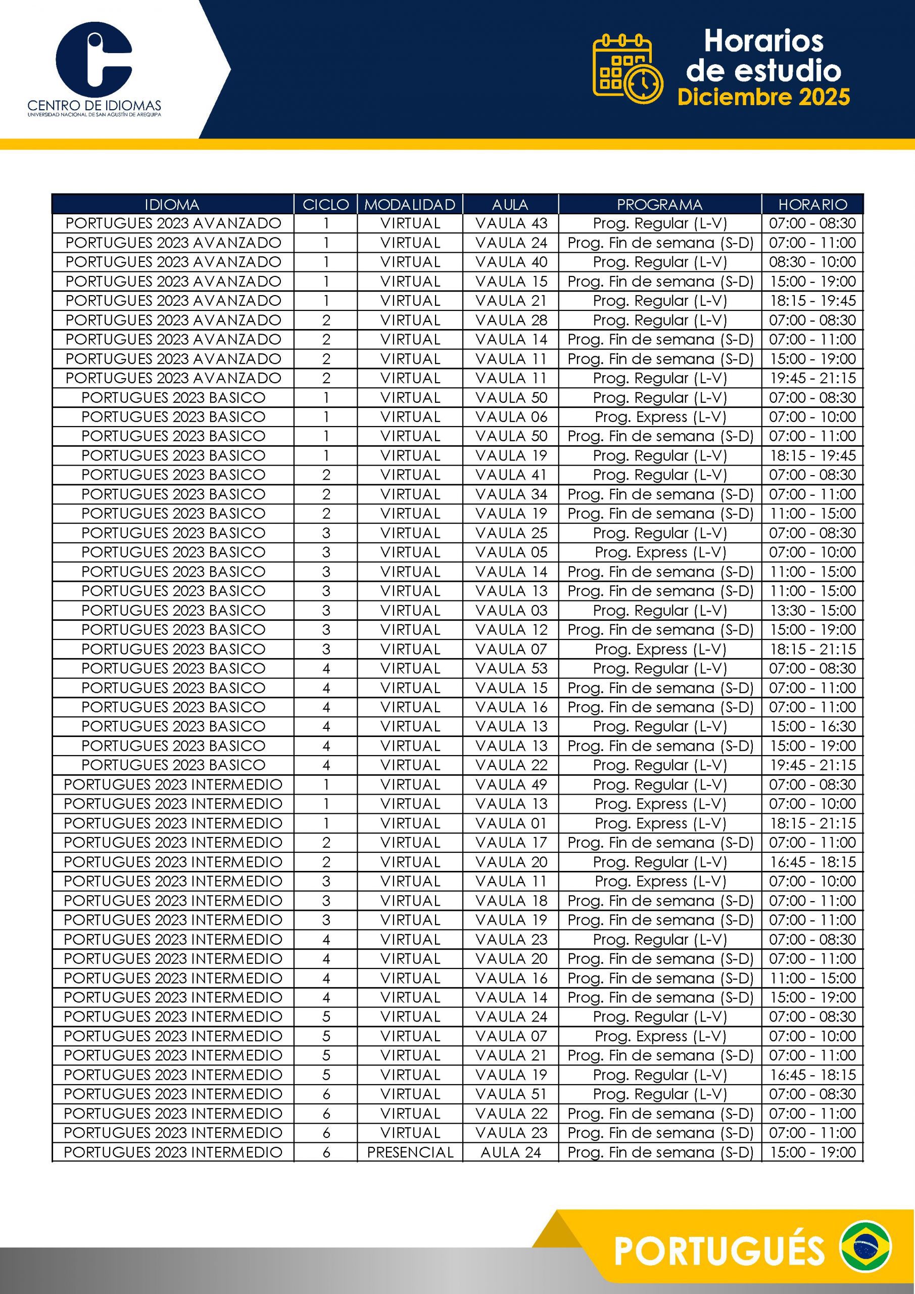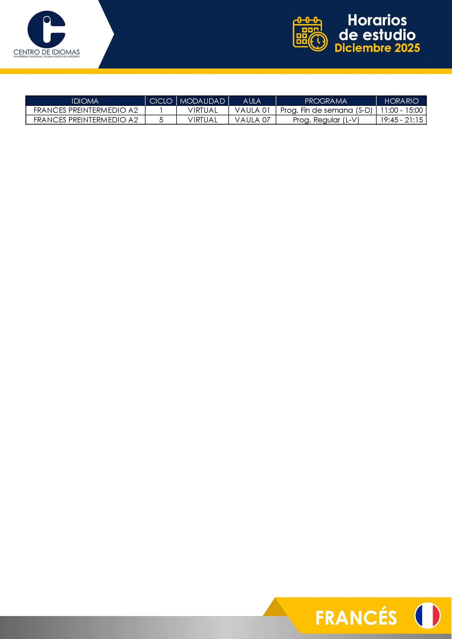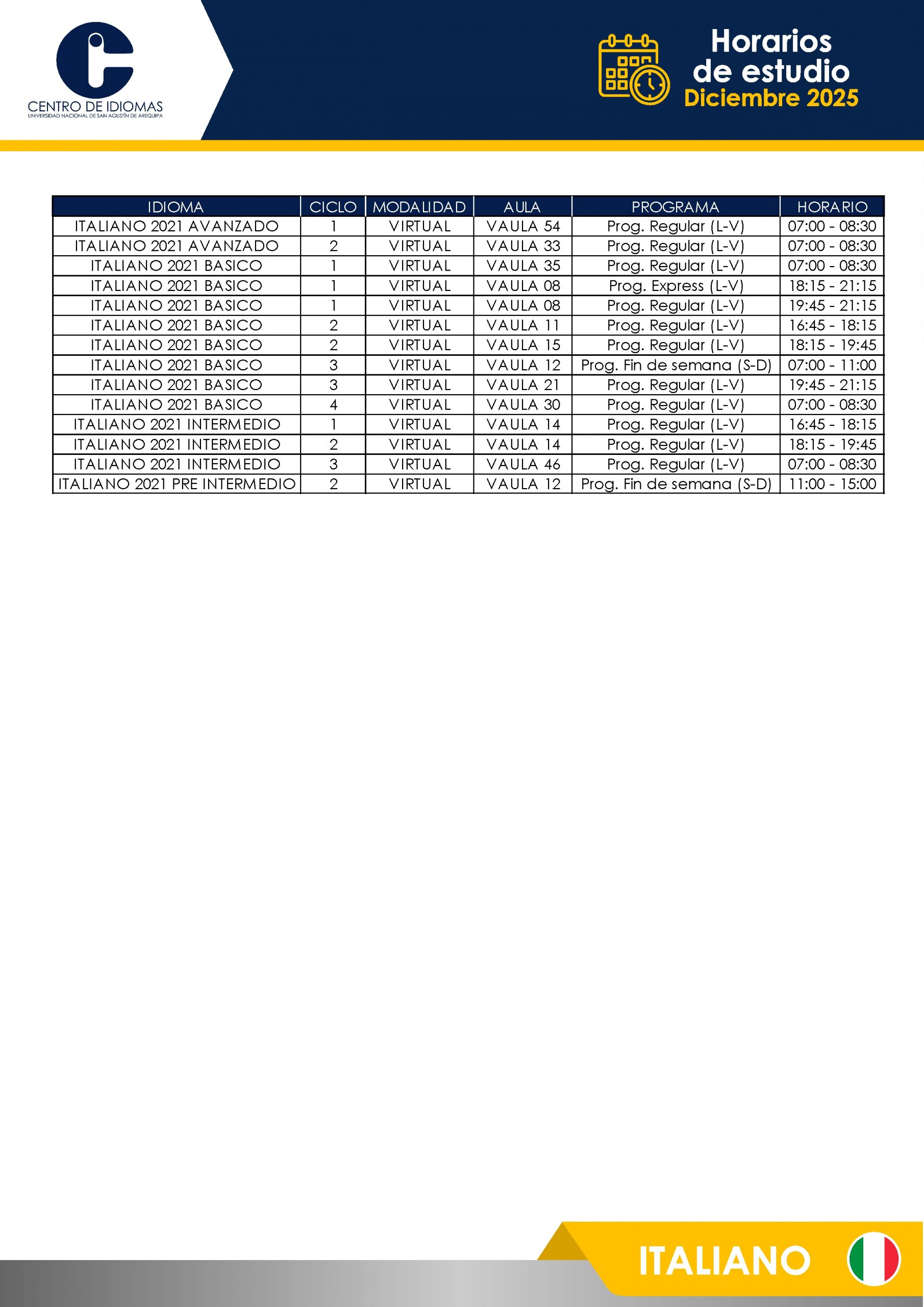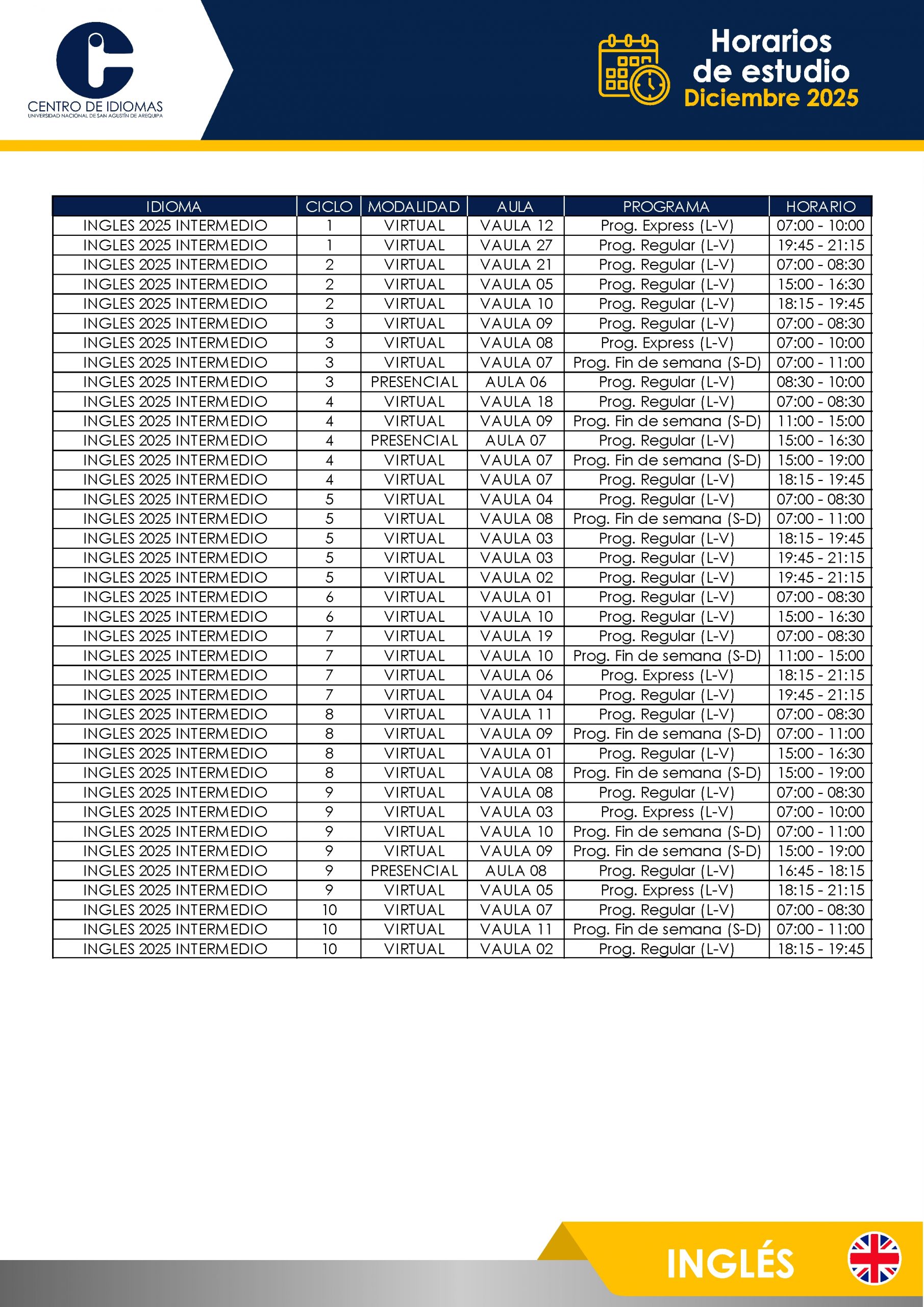 HORARIOS DE ESTUDIO DICIEMBRE 2025 Inglés BASICO 01- 06 BASICO 07 -12 INTERMEDIO AVANZADO Otros idiomas PORTUGUES QUECHUA FRANCES ITALIANO