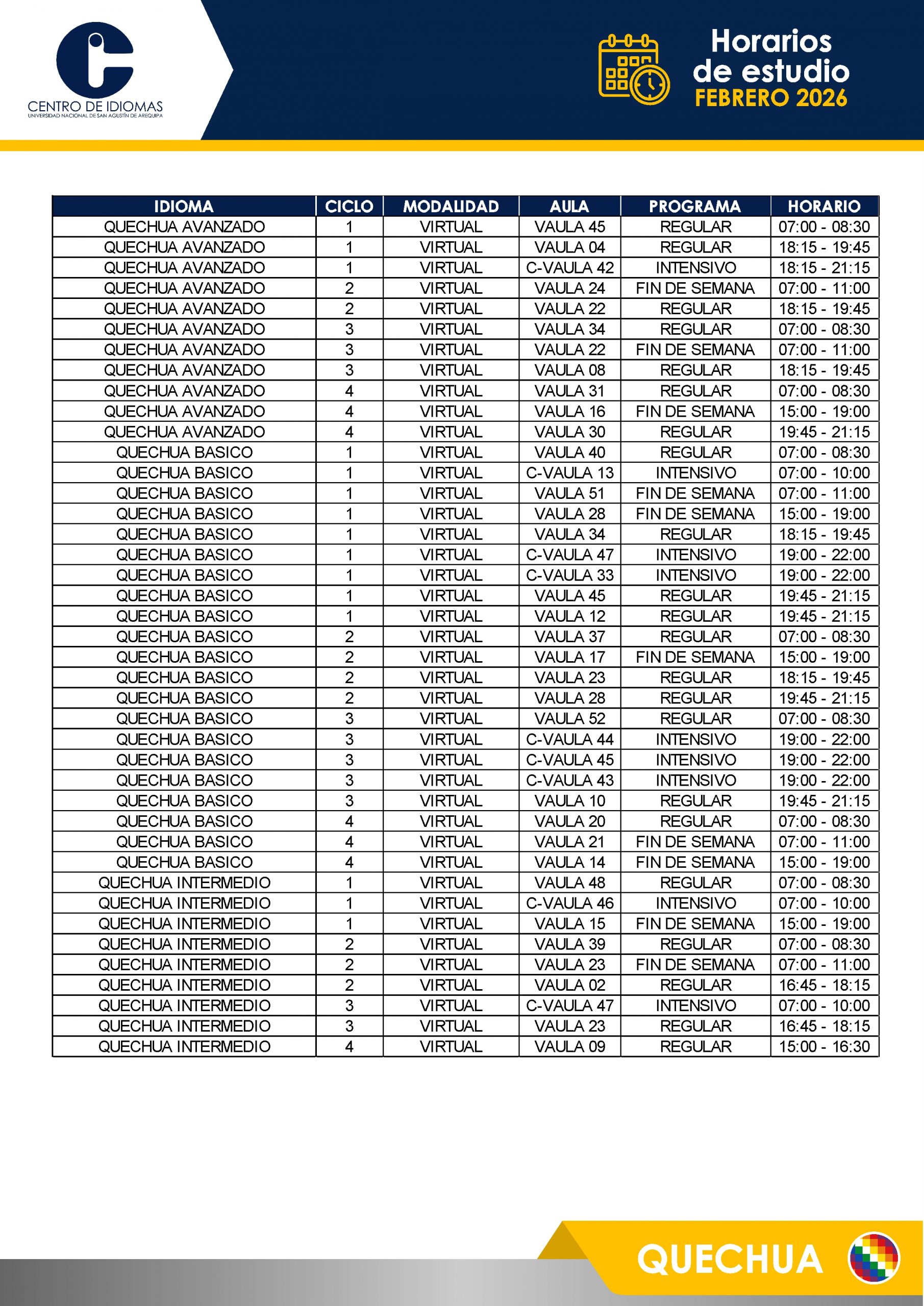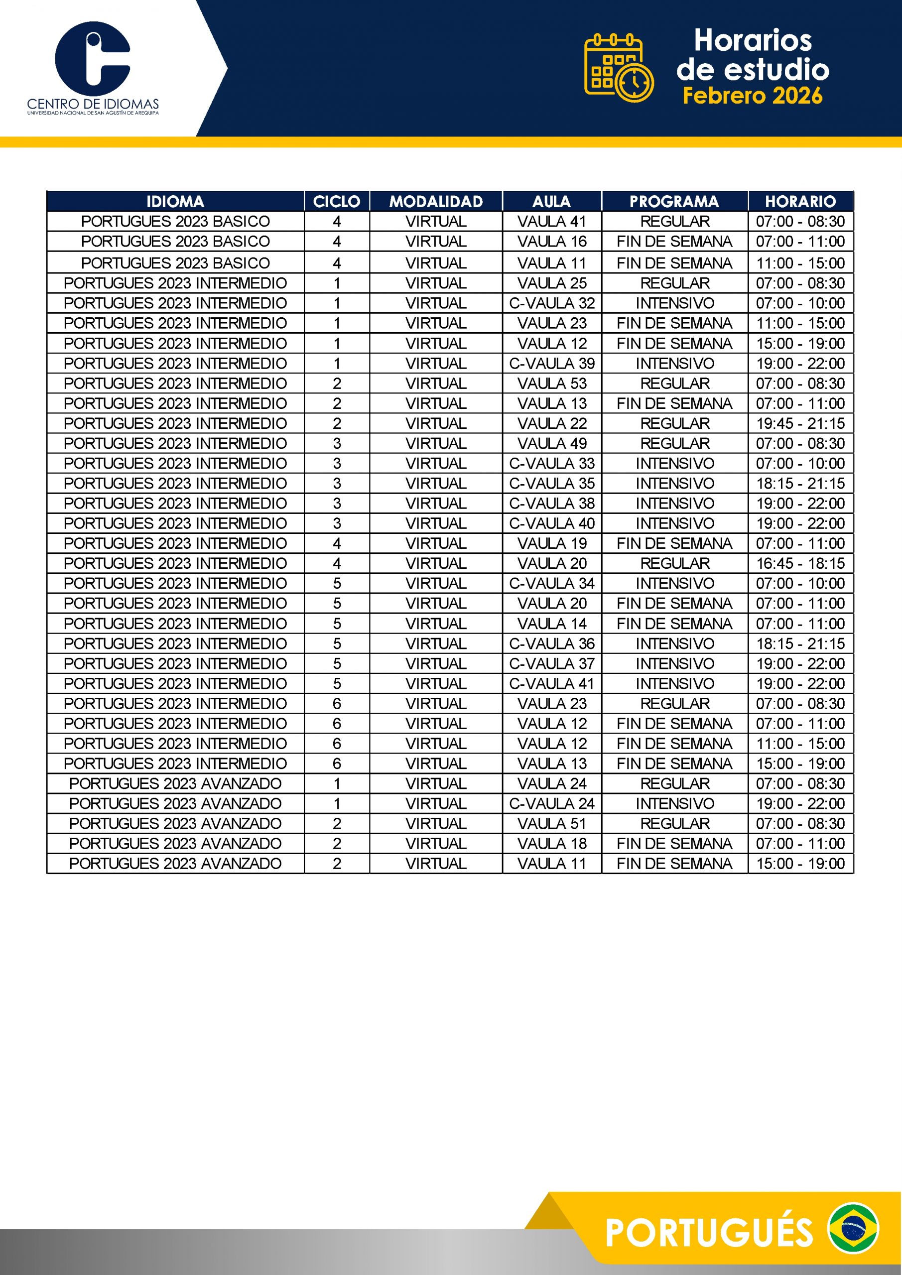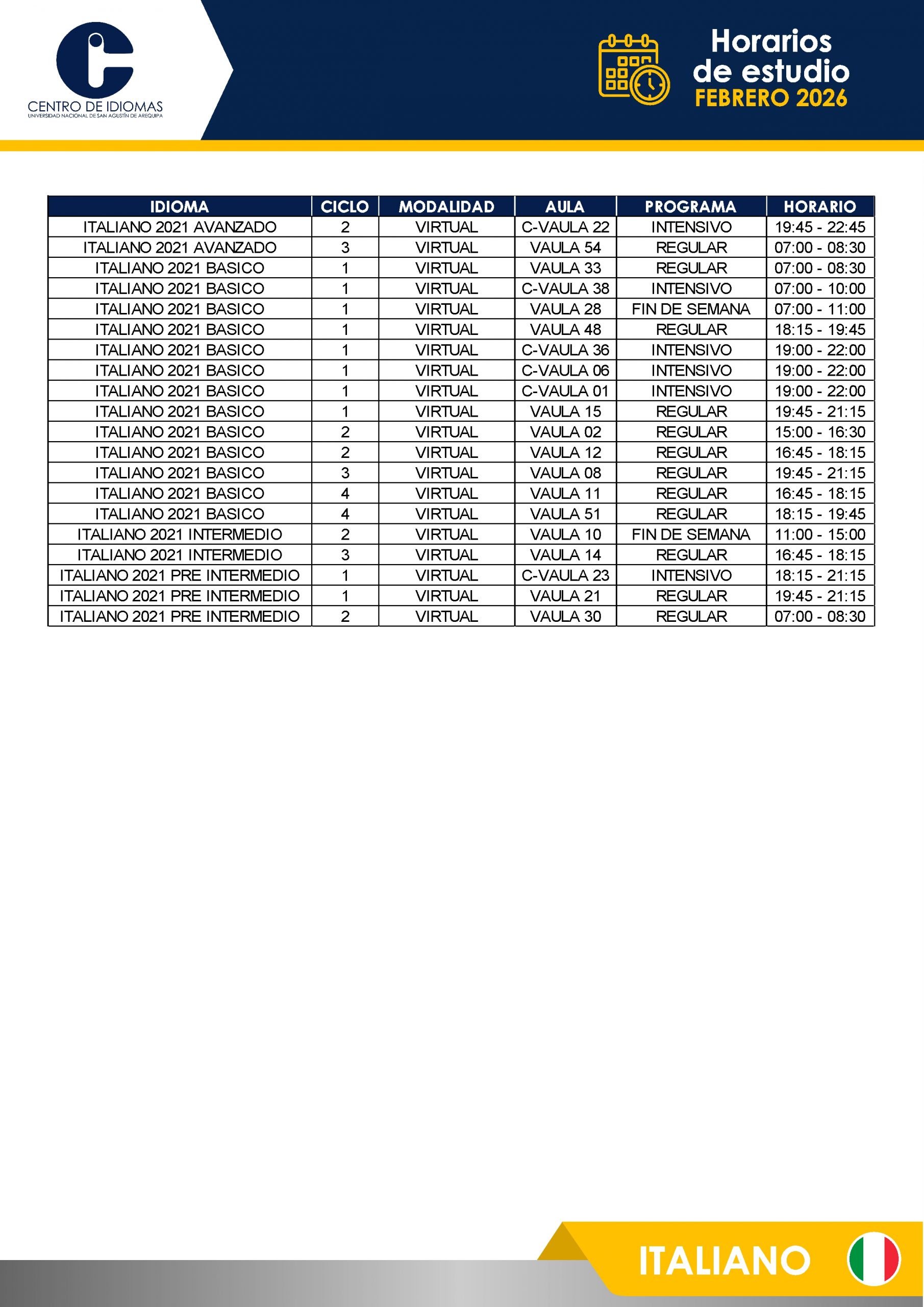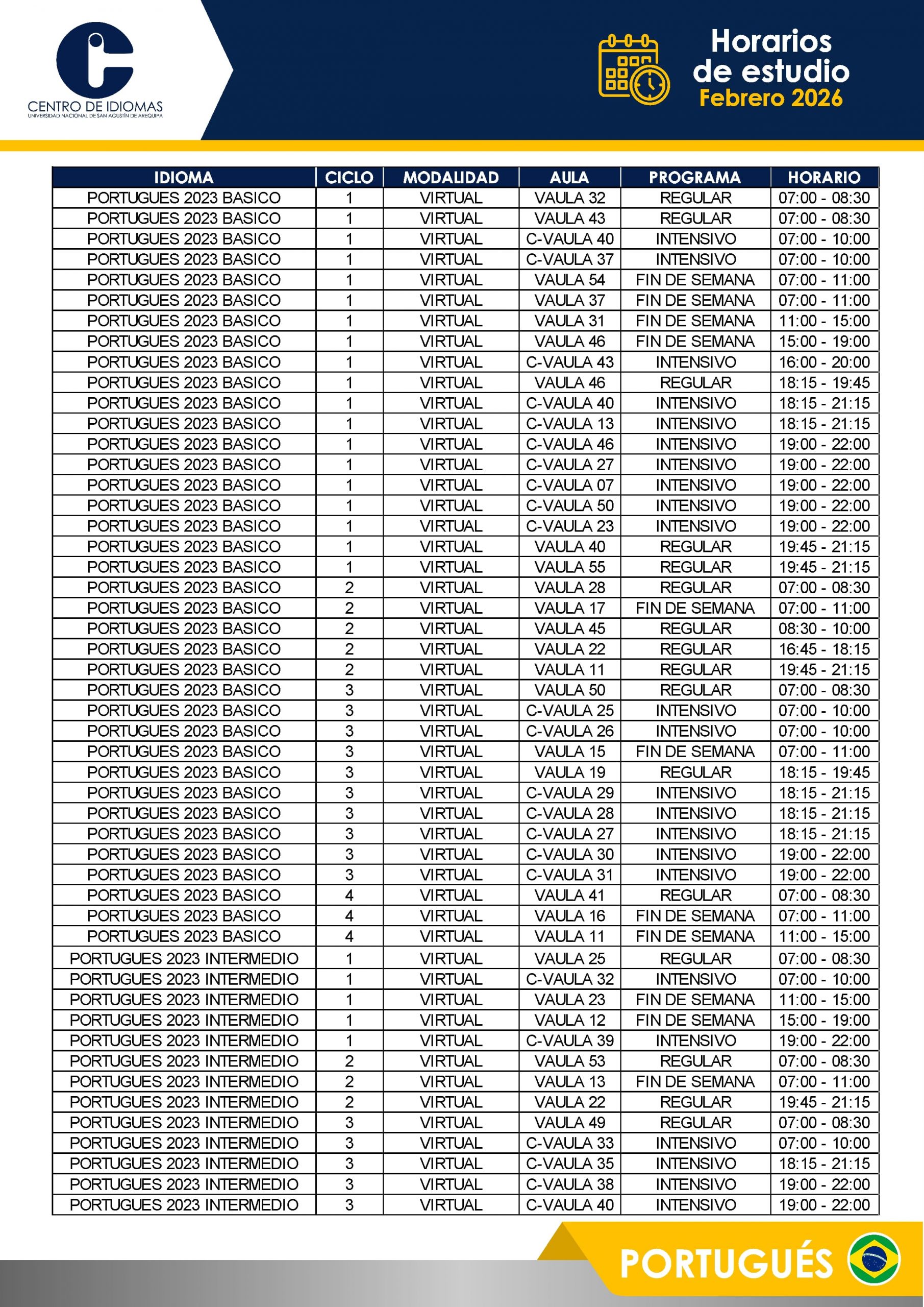 HORARIOS DE ESTUDIO FEBRERO 2026 Inglés BÁSICO 1 – 5 BASICO 6 – 12 INTERMEDIO 1 – 10 AVANZADO 1 – 5 Otros idiomas PORTUGUÉS BASICO PORTUGUÉS INTER QUECHUA FRANCÉS ITALIANO