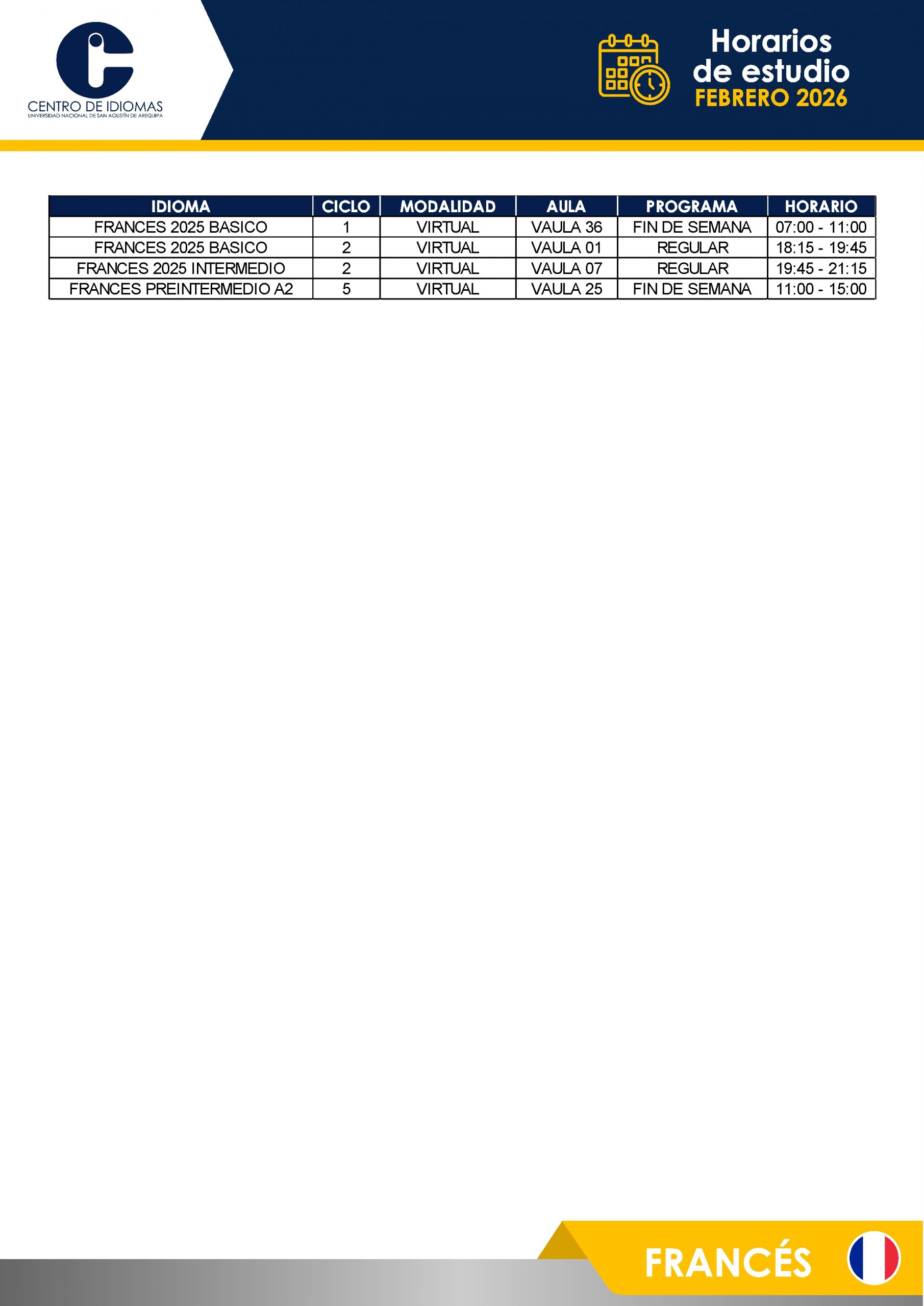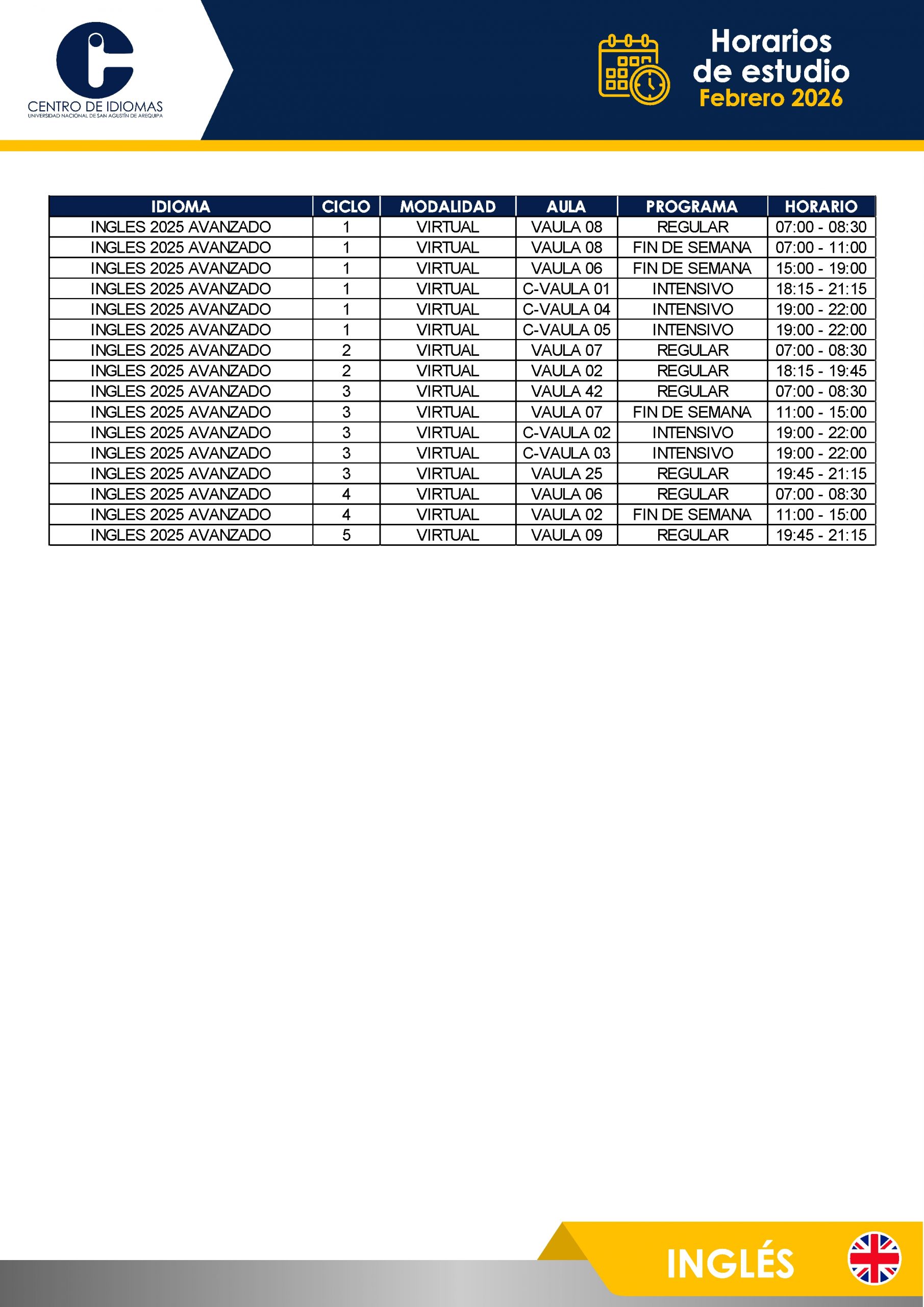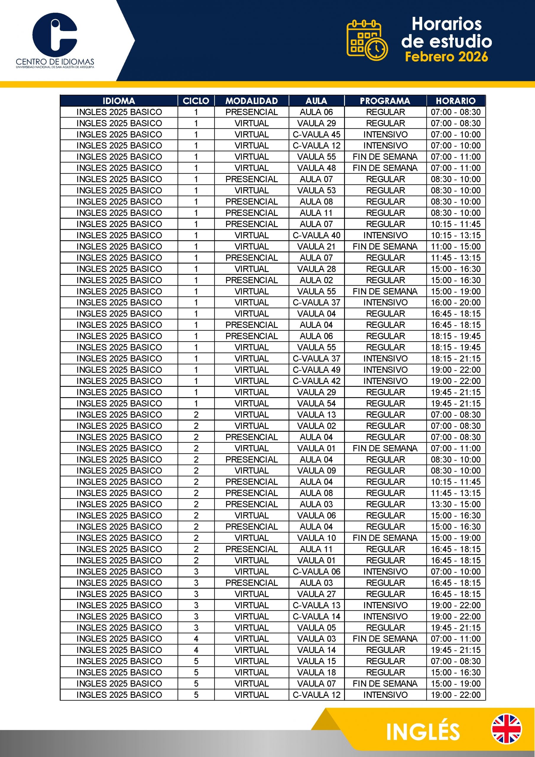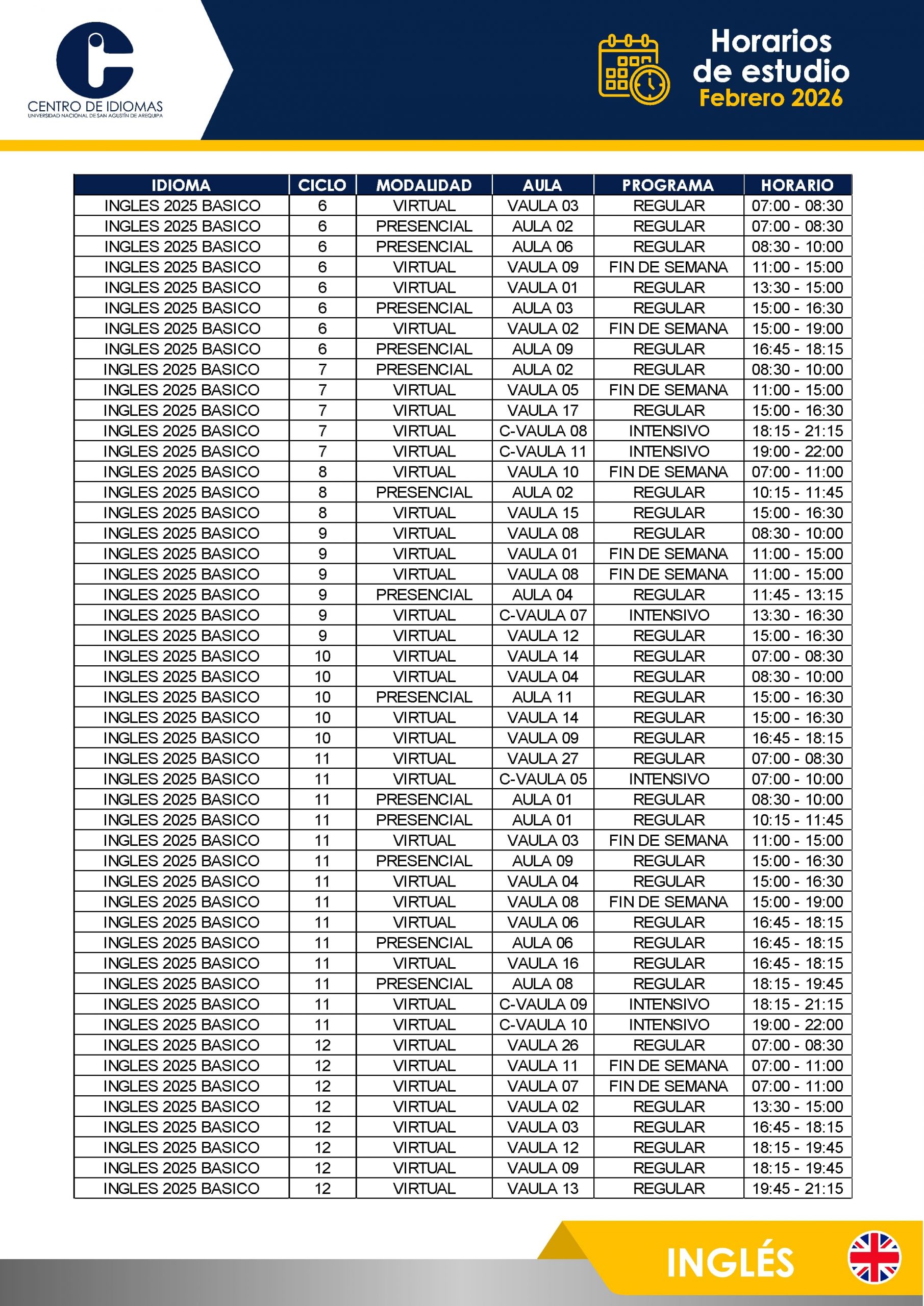 HORARIOS DE ESTUDIO FEBRERO 2026 Inglés BÁSICO 1 – 5 BASICO 6 – 12 INTERMEDIO 1 – 10 AVANZADO 1 – 5 Otros idiomas PORTUGUÉS BASICO PORTUGUÉS INTER QUECHUA FRANCÉS ITALIANO